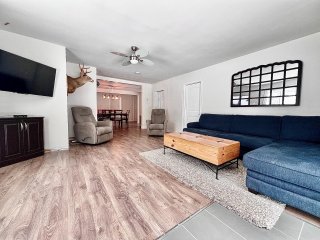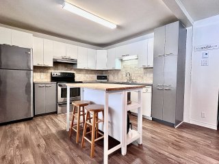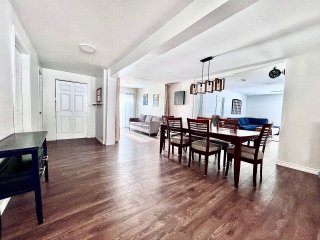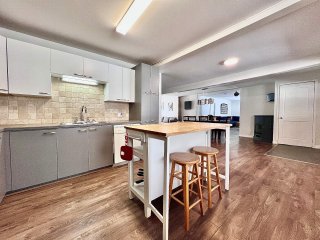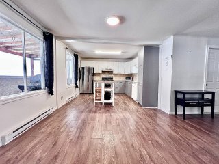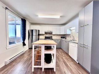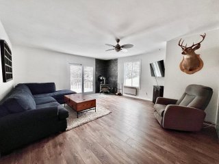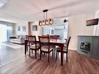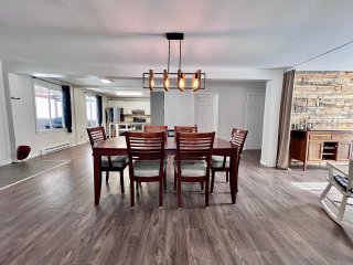La maison propose une configuration conviviale à aire ouverte, où les pièces principales sont de très bonnes dimensions. Dès l'entrée, on remarque l'espace généreux du salon, véritable coeur de la résidence, agrémenté d'un poêle à bois qui crée une ambiance chaleureuse et invitante, idéale pour les saisons plus fraîches. L'aire de vie principale bénéficie d'une belle fluidité entre le salon, la salle à manger et la cuisine, favorisant les rassemblements en famille ou entre amis.