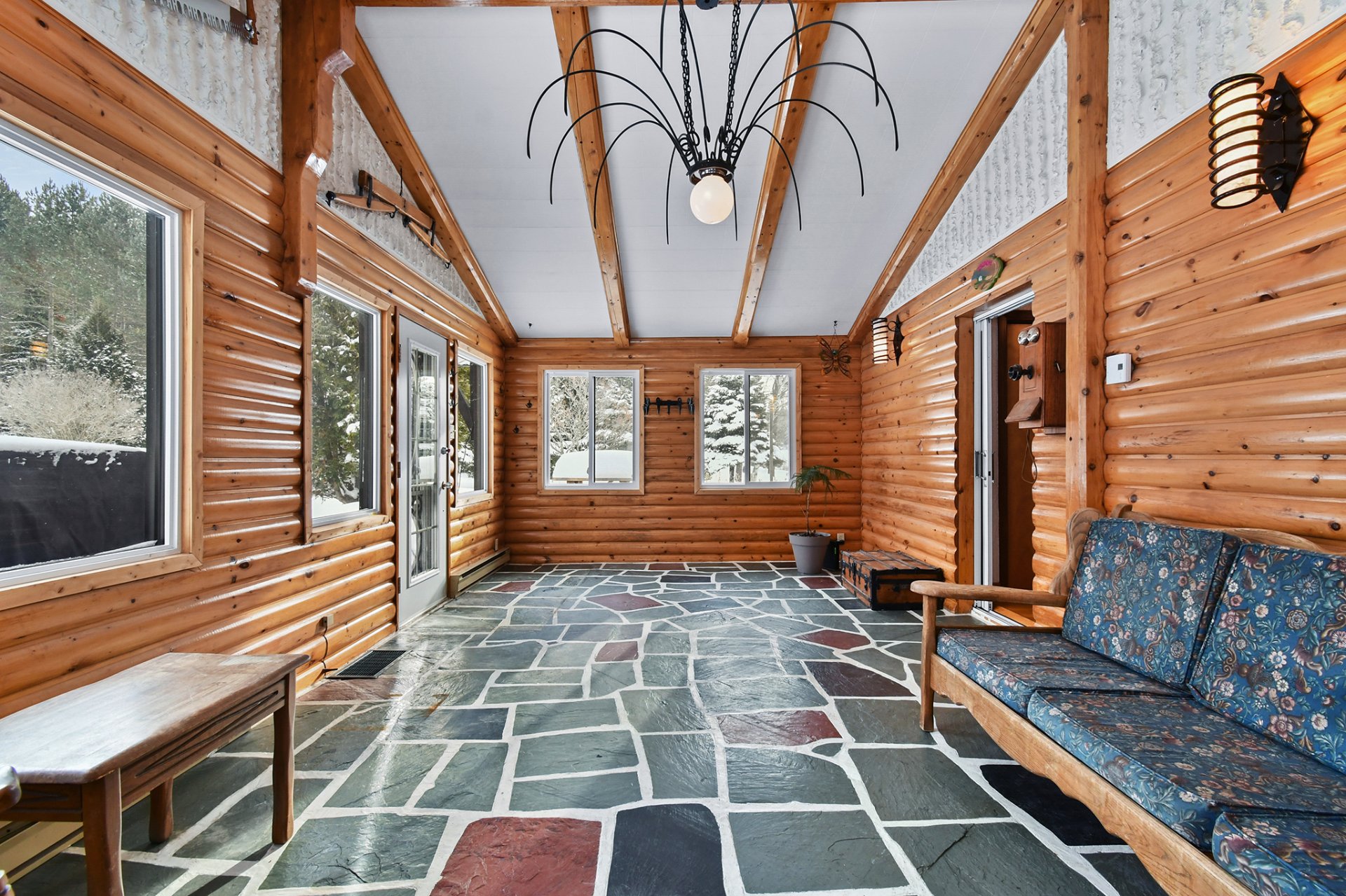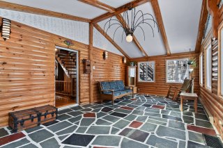 La propriété propose cinq chambres à coucher, dont quatre sont regroupées à l'étage. Salle de bain complète sur chacun des palliers offrant confort et fonctionnalité pour toute la famille. Le deuxième étage pourrait être facilement exploiter en logement puisqu'une entrée indépendante y donne accès. Dès l'entrée, une vaste véranda lumineuse capte le regard. Cette pièce polyvalente peut servir à la fois de salon et de hall d'entrée et offre une vue imprenable sur la terrasse arrière et son remarquable four à pain, véritable invitation aux moments de convivialité. La cuisine, spacieuse et très fonctionnelle, bénéficie de nombreux espaces de rangement et d'une disposition efficace pour le quotidien. Elle s'ouvre sur une grande salle à manger attenante au salon, lequel est agrémenté d'un foyer au bois. Le manteau de cheminée, conçu de façon artisanale en bois martelé, ajoute un cachet chaleureux et authentique à l'espace de vie.