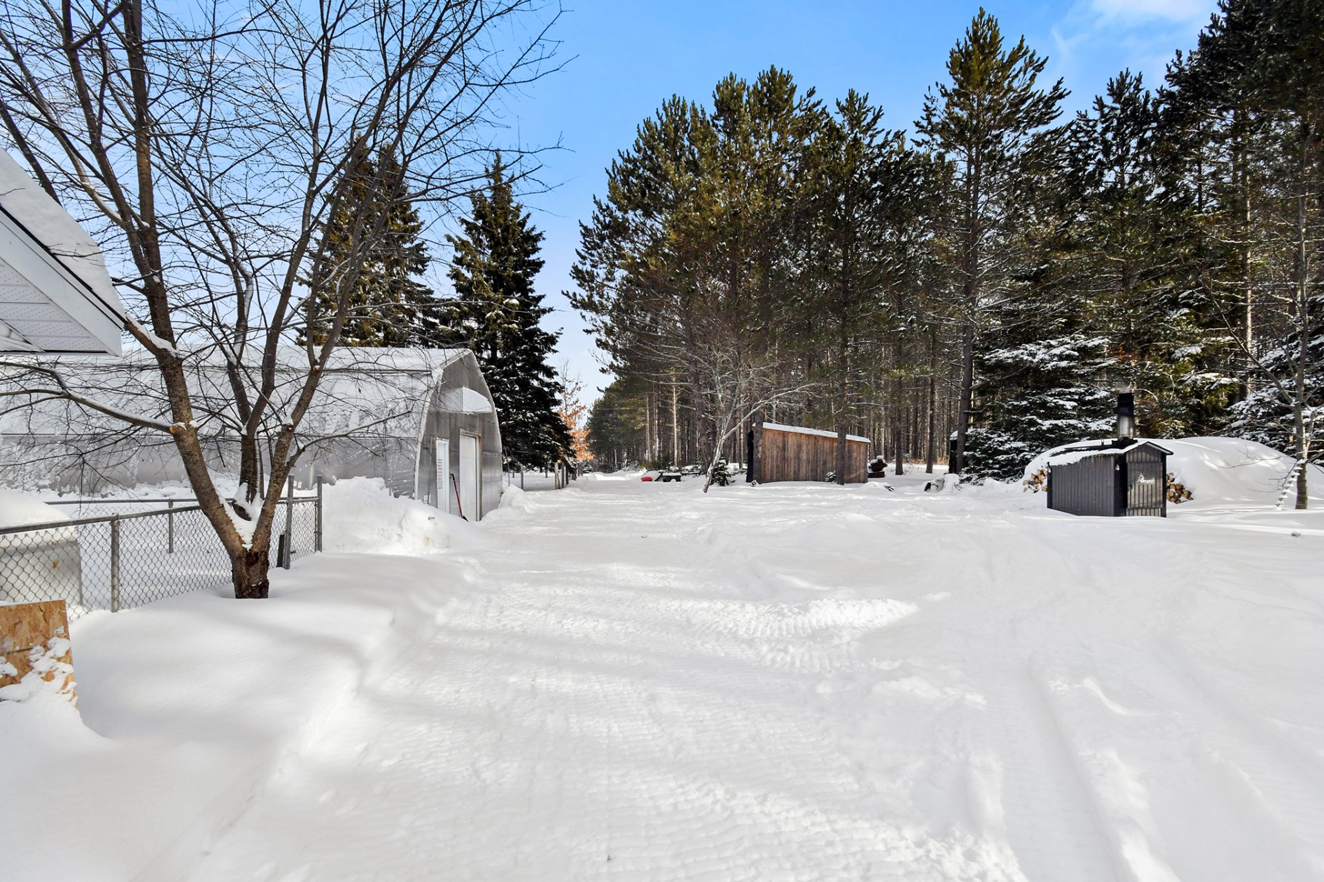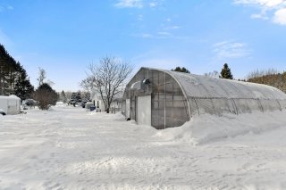 À l'extérieur, le terrain impressionne par sa superficie et la diversité de ses aménagements. Une bleuetière s'étend sur environ deux acres, complétée par une zone de culture maraîchère d'environ deux acres. Deux serres permettent la production de semis et de cultures variées en plus d'une serre de type Harnois de 30X50 avec un chauffage de type (boiler). Plusieurs arbres fruitiers sont également présents, de même qu'un poulailler, un enclos à cochons et une cage autotractée pour le poulet de grain.